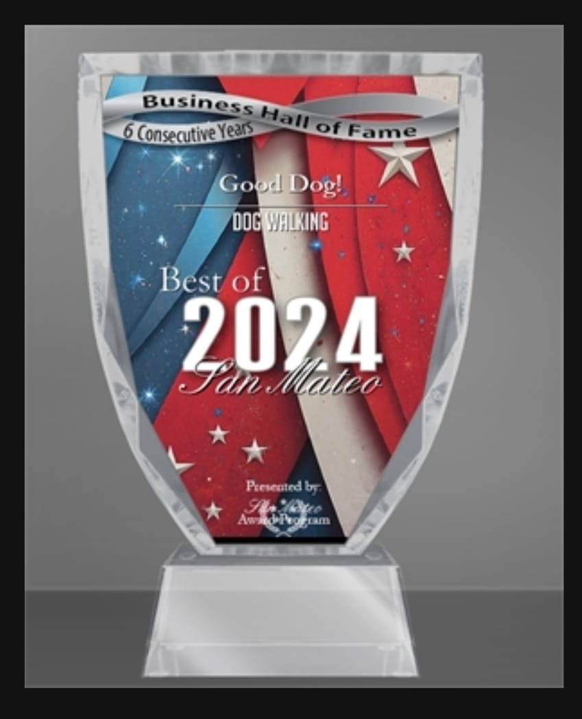 SAN MATEO April 24, 2024 -- Good Dog! has been selected for the 2024 Best of San Mateo Award in the Dog Walking category by the San Mateo Award Program.- Return to Menu